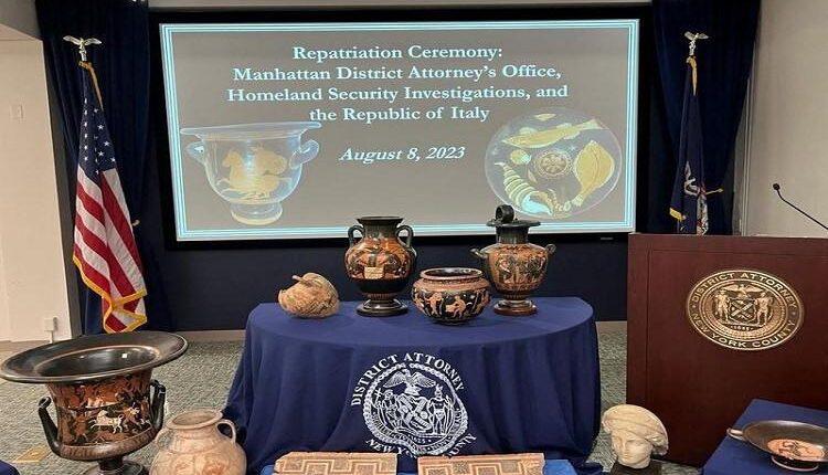وأظهرت صور من وزارة الثقافة الإيطالية القطع الأثرية التي تشمل عدة أوان ورأس تمثال وبعض العملات المعدنية خلال عرضها في حفل أقيم قبل أيام في نيويورك بمناسبة استردادها.