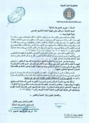 أصدرت وزارة الماليه كتابها الي المراقب المالي بالهيئه العامه للتأمين الصحي والذي جاء فيه تنفيذا لأحكام القضاء باحقيتهم في صرف الحوافز والبدلات والمكافئات والجهود العاديه والأعمال الاضافيه