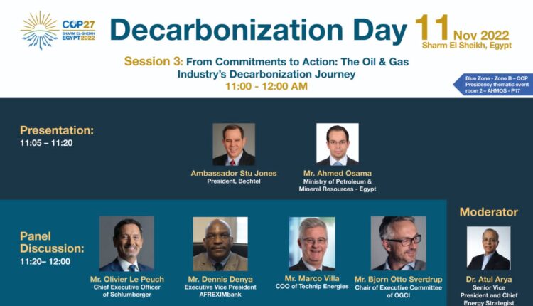 تهتم الجلسة الثانية لصناعة البترول والغاز فى يوم إزالة الكربون المقرر عقده يوم 11 نوفمبر الجارى ضمن فعاليات قمة المناخ COP27 فى شرم الشيخ بالقاء الضوء على جهود صناعة البترول والغاز فى ازالة الكربون بدءاً من التعهدات الى التنفيذ الفعلى ،