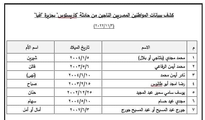 وأشار أحد أهالى القرية، إلى نجاة 20 شابا فقط من أصل 69 شخصا كانوا جميعا متجهين إلى اليونان، موضحا أن أحد الناجين من أهالى القرية، وهو الذي أكد غرق باقى الشباب.