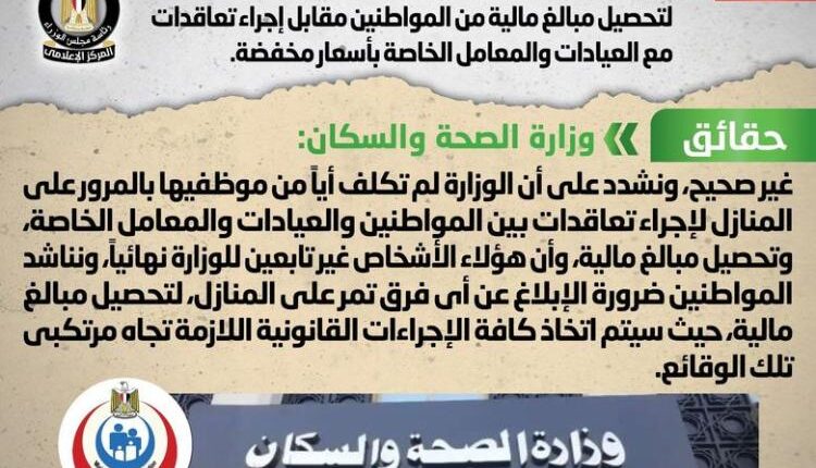 واكدت أنه لا صحة لتوجيه الوزارة أي فرق طبية للمرور على المنازل لتحصيل مبالغ مالية من المواطنين، مُشددةً على أن الوزارة لم تكلف أياً من موظفيها بالمرور على المنازل لإجراء تعاقدات بين المواطنين والعيادات والمعامل الخاصة، وتحصيل مبالغ مالية، وأن هؤلاء الأشخاص غير تابعين للوزارة نهائياً.