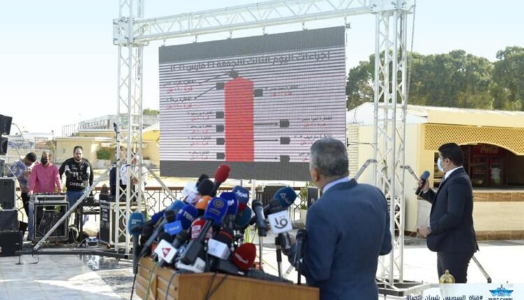 عقد الفريق أسامة ربيع رئيس هيئة قناة السويس، مساء اليوم السبت، مؤتمرا صحفيا للتعليق على تطورات أعمال تعويم سفينة الحاويات البنمية العملاقة EVER GIVEN والتي جنحت بالكيلو ١٥١ ترقيم القناة، بحضور لفيف من وسائل الإعلام المحلية والعالمية، وذلك بنادي الشاطئ التابع للهيئة بمحافظة السويس.