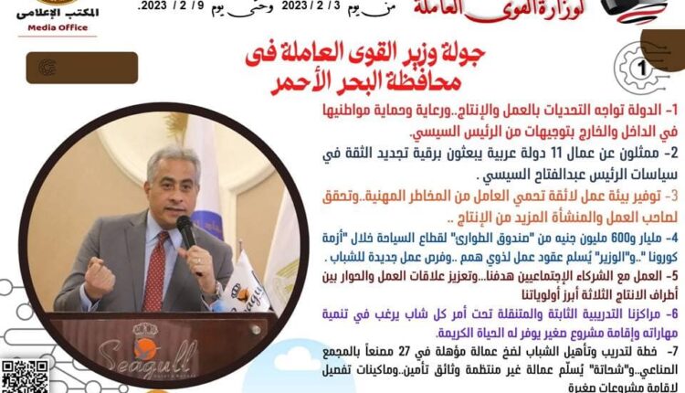 أصدر المركز الإعلامي لوزارة القوى العاملة اليوم الجمعة “إنفوجرافاً “بشأن حصاد “الوزارة” خلال الـ7 أيام الماضية ،والذي بدأ بجولة للوزير حسن شحاتة في محافظة البحر الأحمر ،إستغرقت ثلاثة أيام “72 ساعة” ،ثم لقاء مع وفد من منظمة العمل الدولية التابعة للأمم المتحدة بجنيف،وذلك داخل ديوان عام “الوزارة” جرى خلاله التنسيق والتعاون في ملفات مشتركة..جولة الوزير في “البحر الأحمر ” والتي رافق الوزير فيها اللواء أحمد عبدالعزيز مرزوق نيابة عن اللواء عمرو حنفي محافظ البحر الأحمر،وهارون عبدالعزيز مدير مديرية محافظة البحر الأحمر،وعدد من القيادات التنفيذية والشعبية بالمحافظة ،ووفد مركزي من قيادات “الوزارة”،بدأت بإفتتاح الوزير لفعاليات المجلس المركزي للإتحاد العربي للبنوك والتأمينات والأعمال المالية ،بحضور ممثلون عن نقابات 11 دولة عربية ،ألقى فيه الوزير حسن شحاتة كلمة رصد فيها برامج الحماية والرعاية الإجتماعية التي توفرها الدولة المصرية لمواطنيها في الداخل والخارج ،وتوفير حياة كريمة لهم لمواجهة كافة التحديات الراهنة ،ودعا الملايين من العمال العرب بالتمسك بشعارهم التاريخي “قوتنا في وحدتنا ” ومساندة بلدانهم وعدم الاستجابة لمروجي الشائعات والفتنة والتفرقة في البلدان العربية ،وخلال هذا اللقاء العمالي العربي بعث ممثلوا الملايين من العمال العرب برقية تجديد ثقة الى الرئيس عبدالفتاح السيسي وسياسات الدولة المصرية والداخلية والخارجية،وأشادوا بخطة الدولة في بناء “الجمهورية الجديدة” .. وإستمرت “جولة الوزير” في تلك المحافظة التي يعمل بها 63 الف و621 عاملا في 435 منشأة،وجرى الإعلان عن إنجازات مديرية القوى العاملة فيها حيث تبين ما تحقق من إنجاز خلال العام 2022 فقط، ففى مجال التدريب المهنى عقدت المديرية 25 دورة تدريبية على مهن التفصيل والخياطة ، وكهرباء التوصيلات ، والسباكة الصحية بوحدة التدريب المتنقلة بنظام الساعات المعتمدة استفاد منها 250 متدرب ومتدربة ، اما فى مجال رعاية القوى العاملة فقد قامت بالتفتيش على 5841 منشأة بواقع عدد 27 ألفاً و 652 عامل ، وفحص 371 شكوى عمالية ، وعقد 21 ندوة توعية بأحكام قانون العمل والقوانين ذات الصلة ، كما وفرت 11 ألفاً و 23 فرصة عمل من خلال نشرة التوظيف نصف الشهرية التى تطلقها “الوزارة” ، كما قامت بتشغيل 300 عامل من ذوى القدرات الخاصة،واستخرجت المديرية 191 ترخيص عمل لأجانب، وجددت 106 ترخيص آخرين،كما استخرجت 12 ألفاً و383 شهادة قياس مستوى مهارة ، ورخصة مزاولة حرفة ..