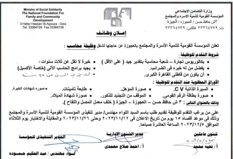 نشرت المؤسسة القومية لتنمية الأسرة والمجتمع التابعة لوزارة التضامن الاجتماعي عبر صفحتها الرسمية على موقع التواصل الاجتماعي حاجة مؤسسة الرعاية الاجتماعية لمتعددي الإعاقات بالطالبية – الهرم، لشغل الوظائف التالية:
