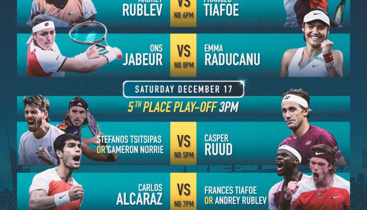 ويفتتح ستيفانوس تسيتسيباس، المصنف الرابع عالمياً، وكاميرون نوري، المصنف الأول على بريطانيا، مباريات اليوم الأول في 16 ديسمبر عند الساعة 04:00 عصراً؛ في حين تنطلق المباراة الثانية في 06:00 مساءً، لتجمع بين حامل اللقب أندري روبليف وفرانسيس تيافوي، المتأهل إلى نصف نهائي بطولة أمريكا المفتوحة للتنس عام 2022.