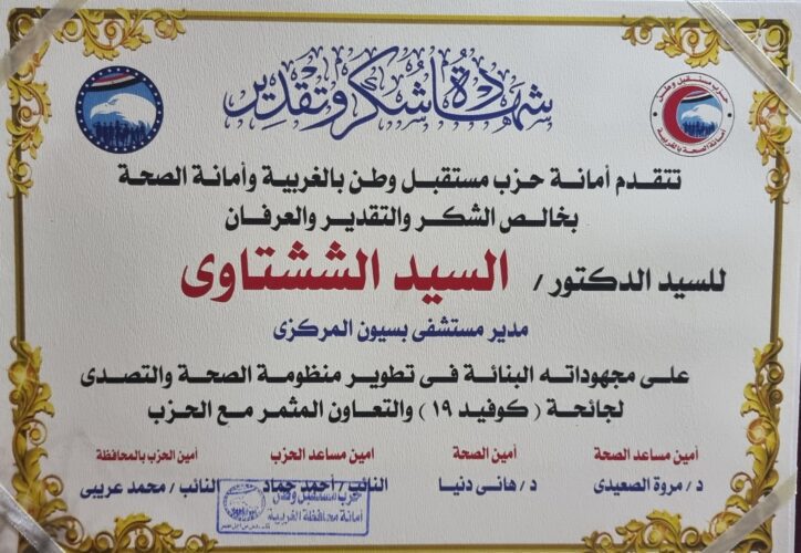 كرم حزب مستقبل وطن بمحافظة الغربية قيادات وكوادر الصحة بمديرية الصحة بالمحافظة والتامين الصحى بالغربية على المجهود الكبير الذي يبذلونه من أجل مكافحة فيروس كرونا وحماية أرواح المواطنين والمرضي.