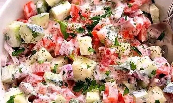 ضعي الخيار في طبق التقديم ثم ضيفي الخليط وقلبي