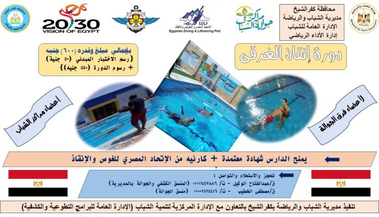 تطلق مديرية الشباب والرياضة بكفرالشيخ، دورة إنقاذ الغرقى، لأعضاء فرق الجوالة و مراكز الشباب التابعة لها بالتعاون مع الإدارة المركزية لتنمية الشباب ” الإدارة العامة للبرامج التطوعية والكشفية” والإتحاد المصري للغوص والإنقاذ، وذلك وفق شروط محددة، برعاية الدكتور أشرف صبحى، وزير الشباب والرياضة و اللواء جمال نور الدين، محافظ كفر الشيخ .