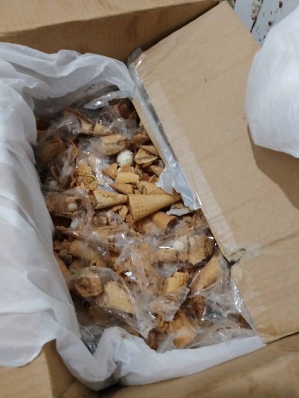 ١٤٠٠ قطعه بسكويت بكريمة الشيكولاته+٢٩٥٠ قطعه شيكولاته تم تصنيعها بشكل غير سليم من مكونات مجهولة المصدر وغير مدون عليها تاريخ الانتاج والصلاحيه بداخل مصنع غير مرخص وغير مستوفي وجارى العرض علي النيابه العامه للنظر والتصرف في القضيه.