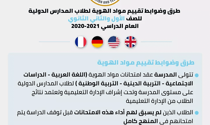 أعلنت وزارة التربية والتعليم والتعليم الفني طرق تقييم وضوابط مواد الهوية لطلاب المدارس الدولية العام الدراسي 2020-2021 .