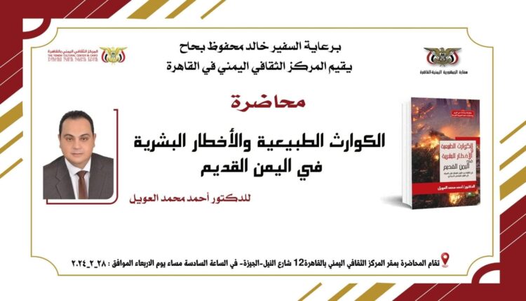 يقيم المركز الثقافي اليمني في القاهرة برعاية السفير خالد محفوظ بحاح مساء غدا الأربعاء المقبل ٢٨ فبراير، محاضرة لمؤلف كتاب”الكوارث الطبيعية والأخطار البشرية في اليمن القديم”، الباحث المصري د. أحمد العويل.