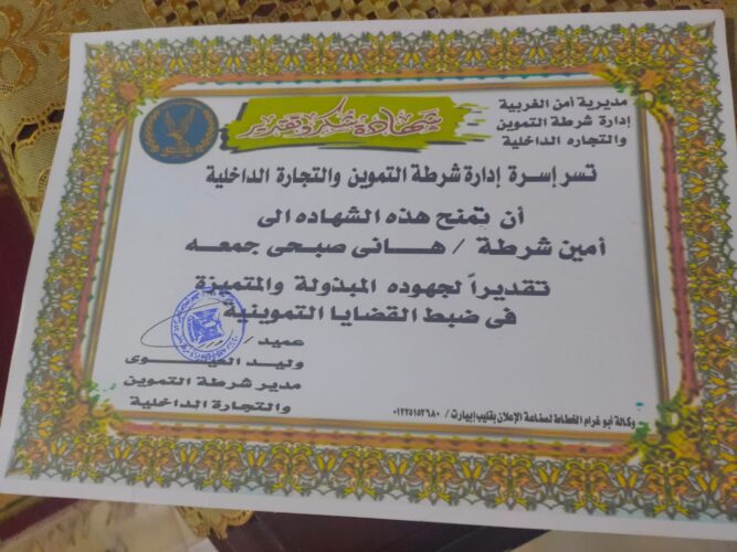 وجاء هذا التكريم لآدائه المتميز فى عمله من خلال التقارير الأمنية التي تُرفع للسيد مدير امن الغربية وادارة شرطة التموين بالغربية عن أداء عمله الأمني