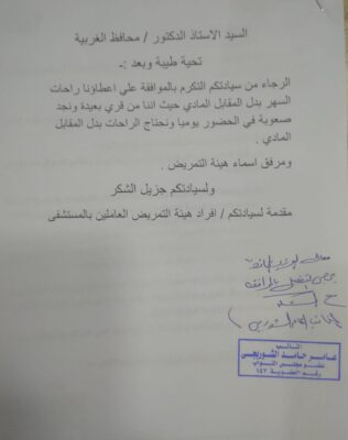 تقدم أكثر من 150 من أسرة هيئة تمريض مستشفي حميات طنطا بطلب للدكتور طارق رحمي محافظ الغربيه وتم تزكيته من النائب عامر الشوربجي عضو مجلس النواب بالسنطه وزفتي والأمين المساعد لأمانة العمال والفلاحين بحزب مستقبل وطن بالامانه العامه بالقاهرة يطالبوا فيه اعطائهم بدل راحات السهر اسوة بما وافقت عليه وزارة الصحة والذي تم تنفيذه في بعض المستشفيات خاصة وأن مقار إقامتهم بالأقاليم ويعانون في الانتقالات والعوده الي العمل ورفضت هيئة التمريض الحصول علي مقابل نقدي بدلا من السهر نهائي.