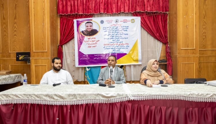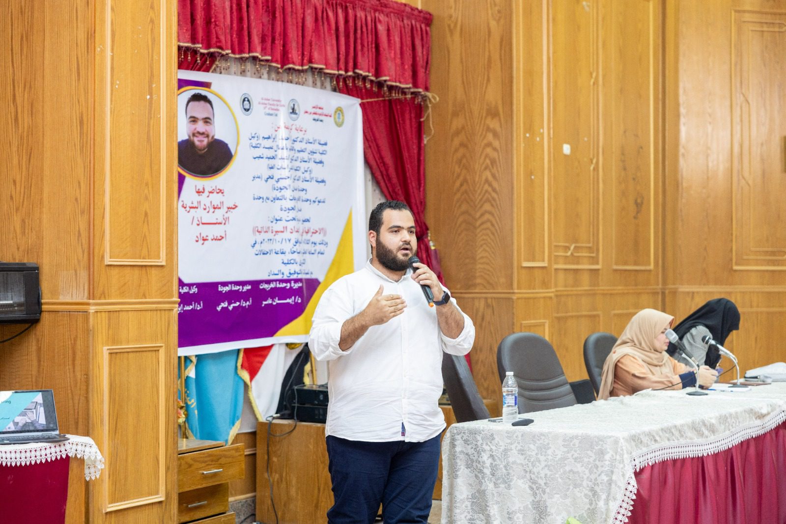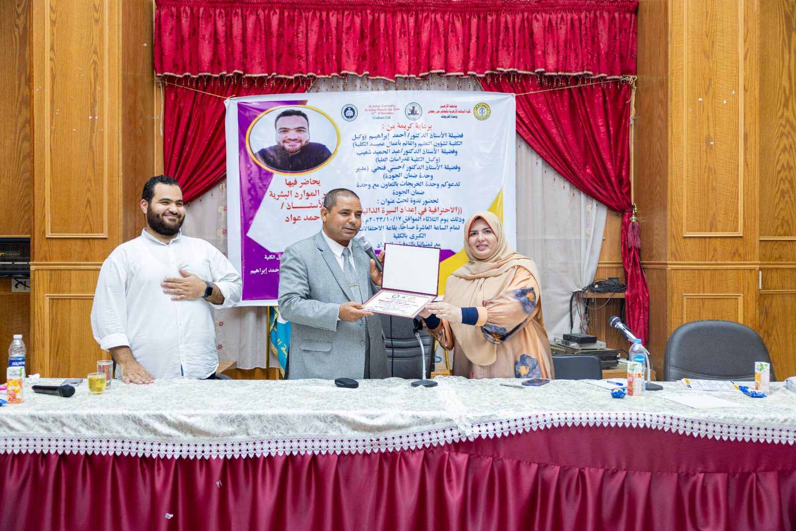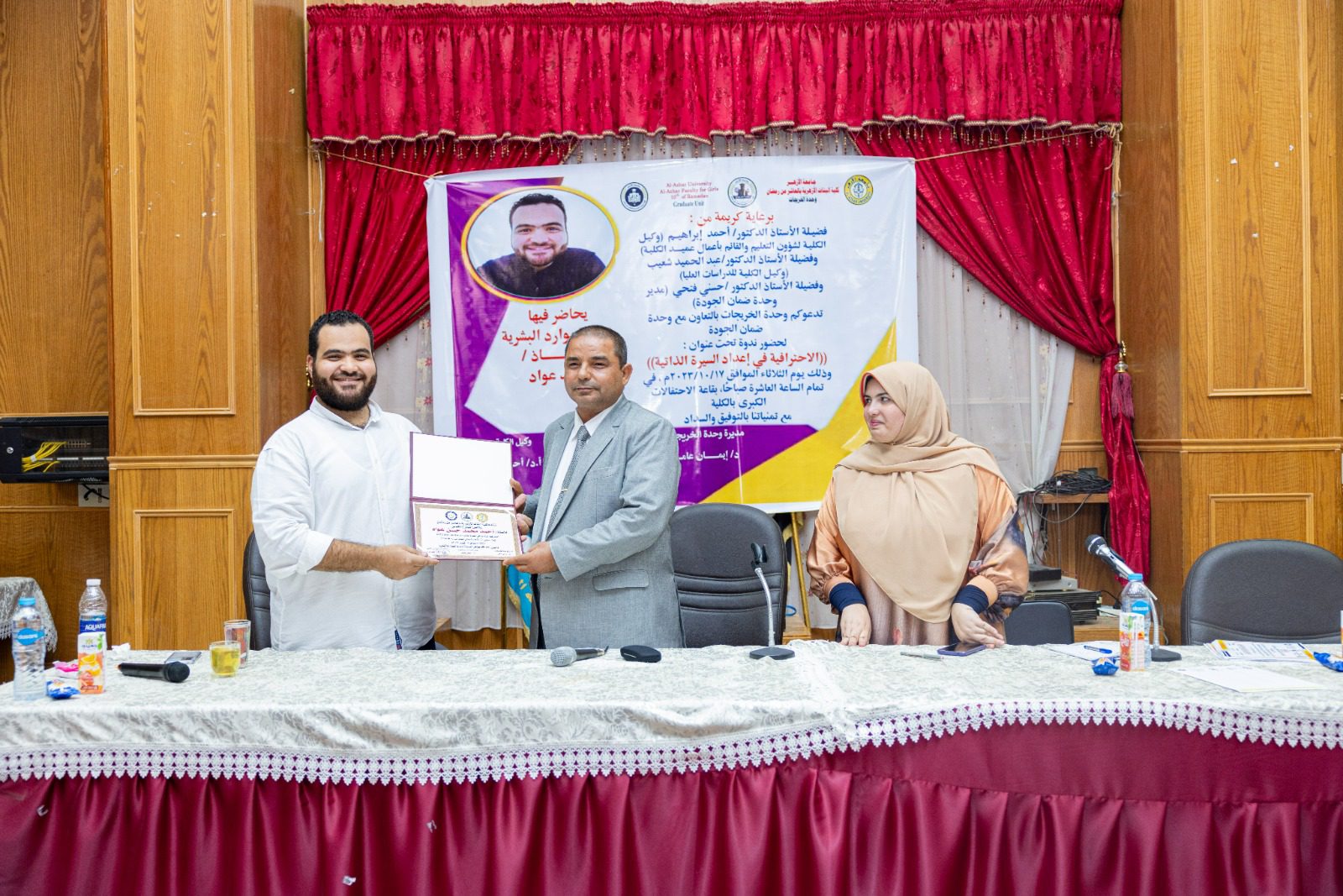 ثم تحدث وكيل الكلية الأستاذ الدكتور أحمد إبراهيم ، حيث قدم الشكر لوحدة الخريجات وأثنى على جميع الفعاليات التي تقدمها في سبيل التواصل مع الخريجات والعمل على تأهيلهم لسوق العمل، وعبر عن سعادته بإقامة هذه الندوة وذكر أن الجامعات الخاصة تحرص على إقامتها للخريجات سنويا ، كما ذكر أن أصحاب الأعمال يسعون دائما لاستقطاب أفضل النماذج من الخريجين فلابد أن تحرص المتقدمة للوظيفة على عرض مهاراتها بشكل جيد من خلال كتابة سيرة ذاتية مميزة.