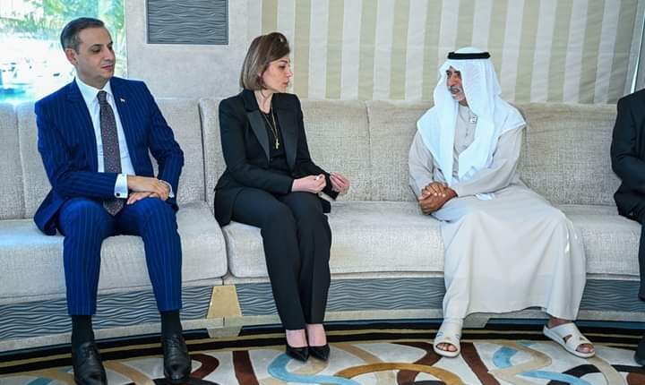 التقت وزيرة الهجرة والمهجرين العراقية ايڤان فائق جابرو، وزير التسامح والتعايش في دولة الإمارات الشيخ نهيان بن مبارك آل نهيان، في أبو ظبي، بحضور سعادة السفير العراقي لدى الامارات الدكتور مظفر مصطفى الجبوري والقنصل العام لجمهورية العراق في دبي سعادة اماد عبد الحميد محمد.