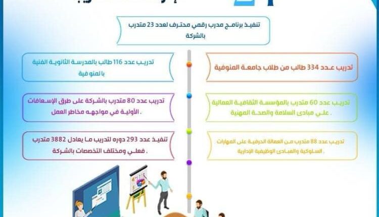 وتابع أنه من أجل الارتقاء بالمستوى المهني لجميع العاملين بالشركة، نفذ قطاع الموارد البشرية عدد 293 دورة لتدريب ما يعادل 3882 متدربا فعليا بمختلف التخصصات بالشركة من خلال مركز التدريب الحاصل على تجديد شهادة اعتماد من المجلس الوطني للتدريب والتعليم وتجديد الاعتماد لشهادة iso 9001/2015 الجودة.
