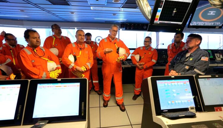 الجولة التفقدية للوزير ومرافقوه علي متن السفينة البحرية للحفر بدأت بشرح إرشادات السلامة من مسئول السلامة والصحة المهنية وقواعد الحفاظ علي السلامة اثناء تفقد سفينة الحفر ، ثم التقي المهندس كريم بدوى بفريق العمل ، و استمع منهم لشرح حول التقنيات المطبقة في عمليات التشغيل والحفر البحري علي اعماق كبيرة في المياه العميقة بالبحر المتوسط ، وتابع الوزير مع فريق العمل الاعمال المنفذة حاليا والمستهدفة لحفر البئرين.