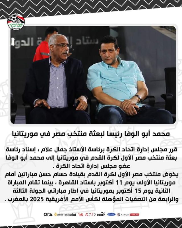 قرر مجلس إدارة اتحاد الكرة برئاسة الأستاذ جمال علام ، إسناد رئاسة بعثة منتخب مصر الأول لكرة القدم في موريتانيا إلى محمد أبو الوفا عضو مجلس إدارة اتحاد الكرة .