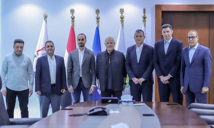 رحب المهندس هاني أبو ريدة رئيس الاتحاد المصري لكرة القدم بوفد لجنة الحكام الإماراتية برئاسة سالم علي الشامسي رئيس اللجنة خلال زيارتهم اليوم لمقر الاتحاد المصري بالسادس من أكتوبر.