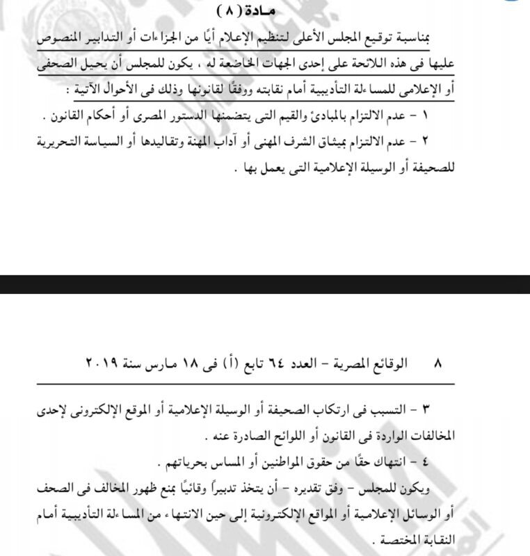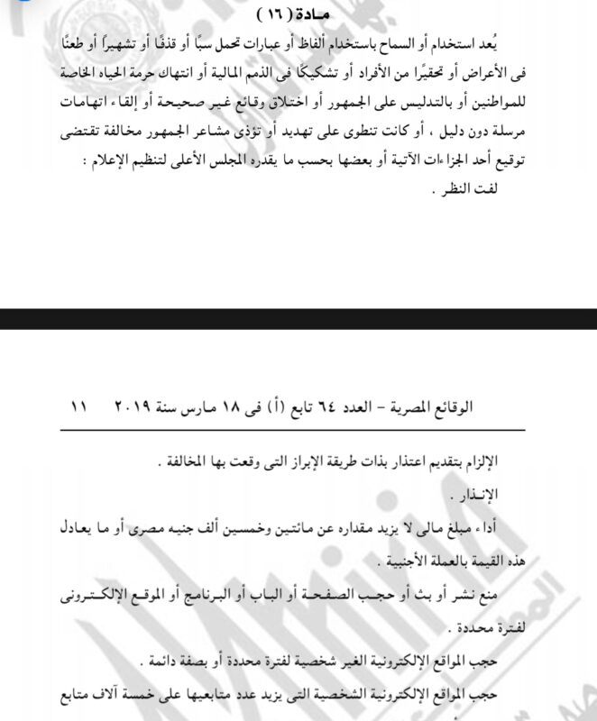 والتي تقول :يُعد استخدام أو السماح باستخدام ألفاظ أو عبارات تحمل سبًا أو قذفًا أو تشهيراً أو طعنًا فى الأعراض أو تحقيرا من الأفراد أو تشكيكًا فى الذمم المالية أو انتهاك حرمة الحياه الخاصة للمواطنين أو بالتدليس على الجمهور أو اختلاق وقائع غير صحيحة أو إلقاء اتهامات مرسلة دون دليل ، أو كانت تنطوى على تهديد أو تؤذى مشاعر الجمهور مخالفة تقتضى توقيع أحد الجزاءات الآتية أو بعضها بحسب ما يقدره المجلس الأعلى لتنظيم الإعلام :