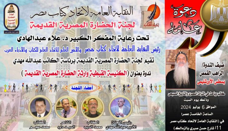 الندوة برعاية المفكر الدكتور علاء عبدالهادى رئيس النقابة العامة لاتحاد كتاب مصر والأمين العام للاتحاد العام للكتاب والأدباء العرب ، تحت عنوان «الكنيسة القبطية وارثة الحضارة المصرية القديمة».