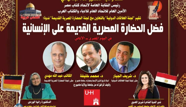 تنظم لجنة الحضارة المصرية القديمة ولجنة العلاقات الدولية بالنقابة العامة لاتحاد كتاب مصر ندوة بعنوان «فضل الحضارة المصرية القديمة على الإنسانية» يوم الاثنين ١٧ من فبراير ٢٠٢٥ م الساعة السابعة مساء بمقر النقابة العامة لاتحاد كتاب مصر ١١ أ شارع حسن صبرى بالزمالك.