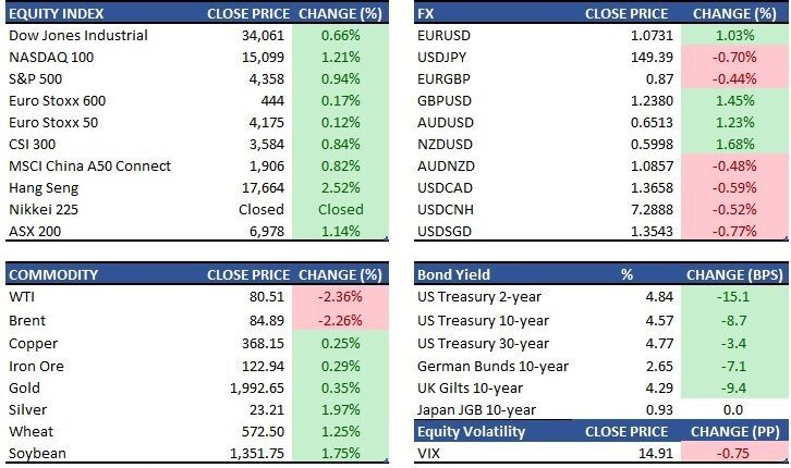 تجاوزت أرقام الوظائف الأمريكية التوقعات، مما يؤكد على وجهة النظر القائلة بأن دورة تشديد بنك الاحتياطي الفيدرالي قد انتهت. كما ارتفعت الأسهم والسندات نتيجة لذلك، بينما تم بيع الدولار. ارتفع الدولار الأسترالي مقابل الدولار فوق 0.65 والمخاطر مرتفعة مع اجتماع بنك الاحتياطي الأسترالي غداً. أعلنت السلطات الصينية عن تدابير لتوسيع الوصول إلى الأسواق وتعزيز الواردات أيضاً. أغلق النفط بانخفاض بنحو 5 ٪ الأسبوع الماضي بينما أدى توقف بنك الاحتياطي الفيدرالي إلى إغلاق سوق النحاس على ارتفاع بنسبة 1 ٪.