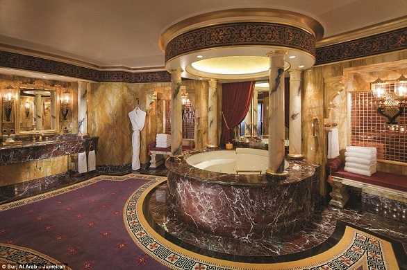 يمتد الجناح الملكي في برج العرب بمدينة دبي على مساحة 8.395 قدماً مربعاً، بمفروشاته الفخمة وميزاته الحصرية التي تشمل مصعداً خاصاً وداراً للسينما. بالإضافة إلى الحمامات الرئيسية التي تحتوي على جاكوزي كامل الحجم، ودوش منفصل، وعدداً من الركائز الفخمة.