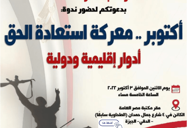 بمناسبة الذكري 49 لنصر أكتوبر المجيد يعقد مركز الحوار للدراسات السياسية والإعلامية بالتعاون مع جمعية صوت الخير للتنمية والبحوث ومكتبة مصر العامة ندوة تثقيفية تحت عنوان ” أكتوبر . . معركة استعادة الحق أدوار إقليمية ودولية “