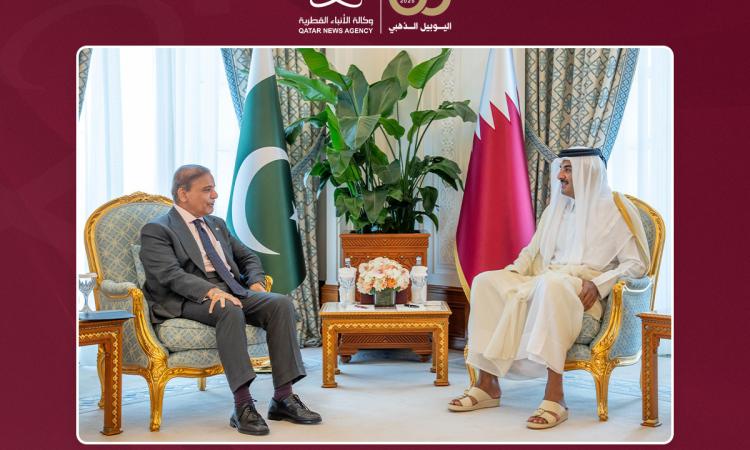 بحث أمير دولة قطر، الشيخ تميم بن حمد آل ثاني، مع رئيس وزراء جمهورية باكستان الإسلامية، محمد شهباز شريف، خلال اجتماع بالديوان الأميري القطري، العلاقات الثنائية بين البلدين وسبل دعمها في شتى المجالات، بالإضافة إلى مناقشة مستجدات الأوضاع الإقليمية والجهود المبذولة لتحقيق السلام والاستقرار لصالح شعوب المنطقة كافة.