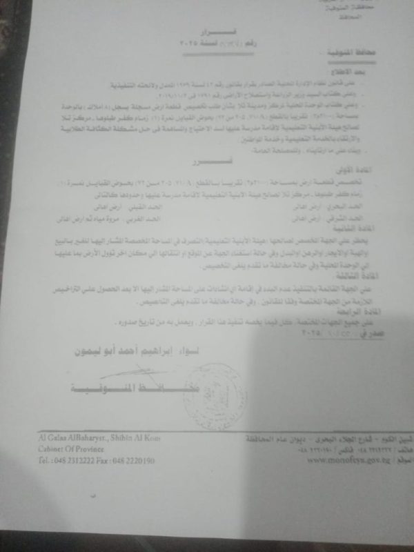 ويأتي هذا الشكر عقب صدور القرار التنفيذي رقم 1637 لسنة 2025، والذي قضى بتخصيص قطعة أرض في منطقة حوض القبائل رقم 1 لصالح الهيئة العامة للأبنية التعليمية ، الهدف من التخصيص هو إقامة مدرسة جديدة للتعليم الأساسي بالقرية، ما يمثل خطوة هامة في دعم البنية التحتية التعليمية بالمنطقة.