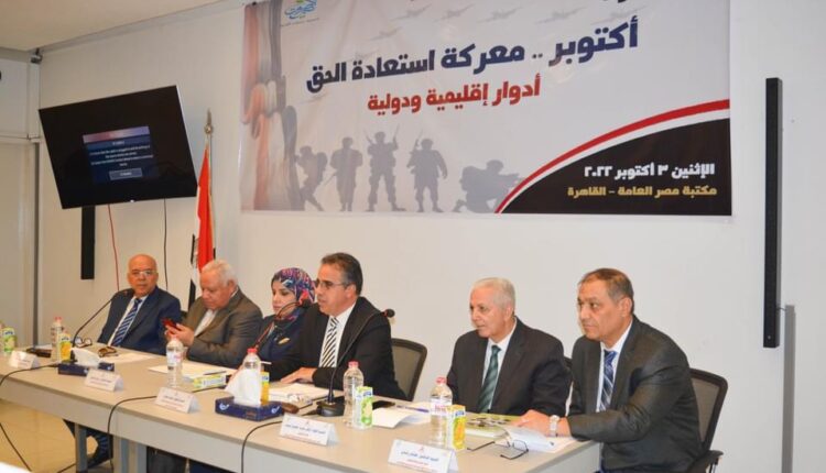 نظم مركز الحوار للدراسات السياسية والإعلامية بالتعاون مع جمعية صوت الخير للتنمية والبحوث ومكتبة مصر العامة أمس الإثنين ندوة بعنوان “أكتوبر .. معركة استعادة الحق: أدوار إقليمية ودولية”، وذلك بقاعة المؤتمرات بمكتبة مصر العامة بالقاهرة.