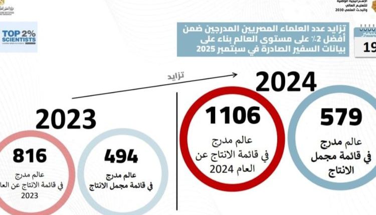 حقق العلماء المصريون إنجازا علميا بارزا في نتائج قائمة ستانفورد لأفضل 2% من العلماء الأكثر تأثيرا حول العالم، والتي تنشر بالتعاون بين جامعة ستانفورد وشركة “إلسيفير”، لتحديد العلماء الأكثر تأثيرا عالميا بناء على مؤشرات الاستشهادات العلمية (Citations) وعدد الأبحاث.
