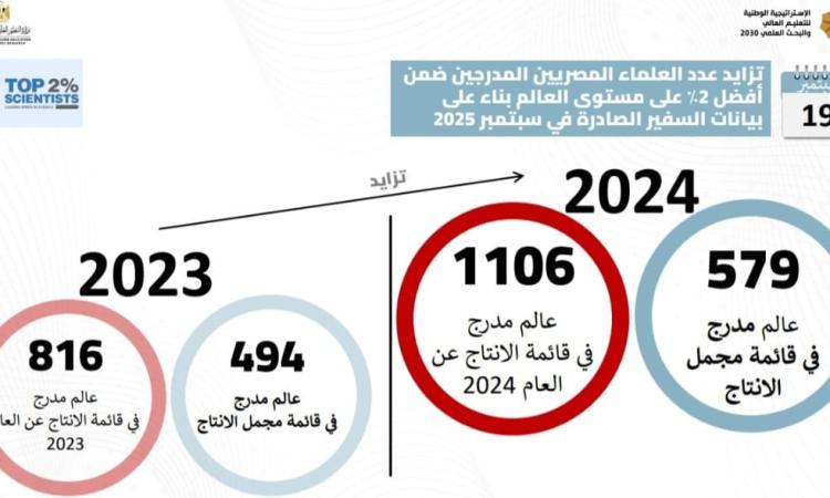 وقد أظهرت النتائج إدراج 1106 عالما مصريا في نسخة القائمة الخاصة بالتميز في الإنتاج العلمي، وإدراج 579 عالما مصريا في نسخة القائمة لمجمل الإنتاج العلمي لعام 2024.