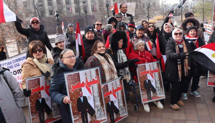 توافد عدد كبير من أبناء الجالية المصرية بالولايات المتحدة أمام مقر إقامة الرئيس السيسي بواشنطن