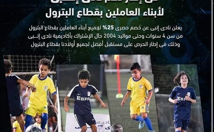 قرر نادى إنبي برئاسة أيمن الشريعى توفير خصم ٢٥% لجميع أبناء العاملين بقطاع البترول من سن ٤ سنوات وحتى مواليد ٢٠٠٤ ، حال الاشتراك بأكاديميات نادى إنبى لكرة القدم بفرعيها “الكيلو ١٧ وبتروسبورت”