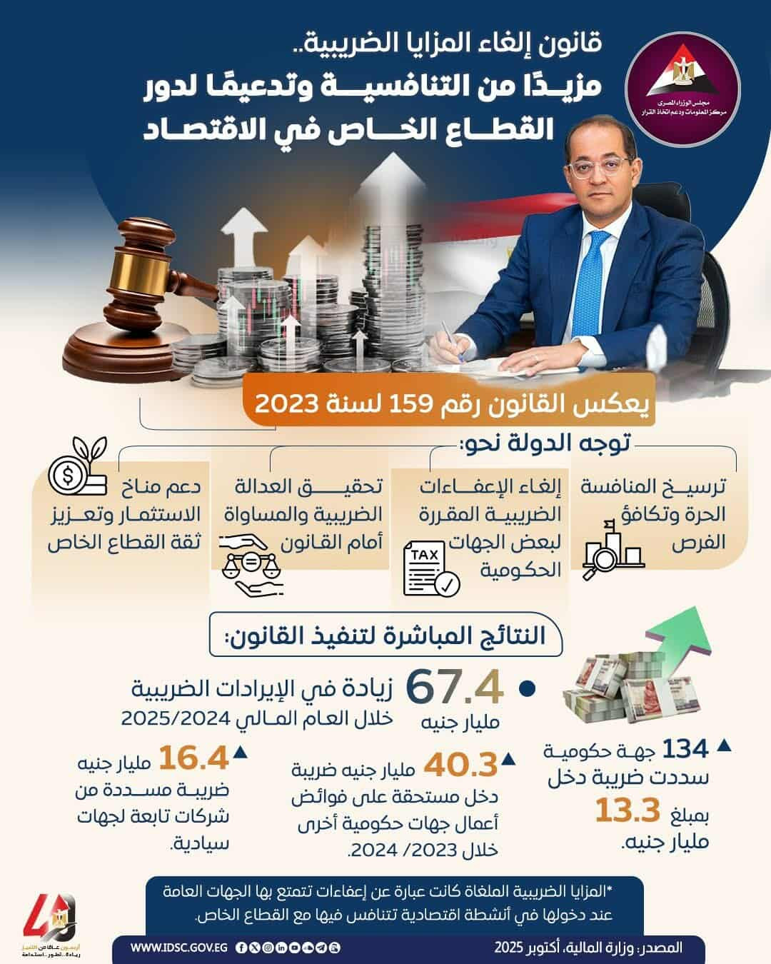 أعلنت وزارة المالية النتائج المباشرة بالأرقام لتنفيذ قانون إلغاء المزايا الضريبية وعلاقتها بزيادة الإيرادات الضريبية المحصلة من بعض الجهات الحكومية خلال العام المالي 2025/2024 بحوالي 67.4 مليار جنيه.