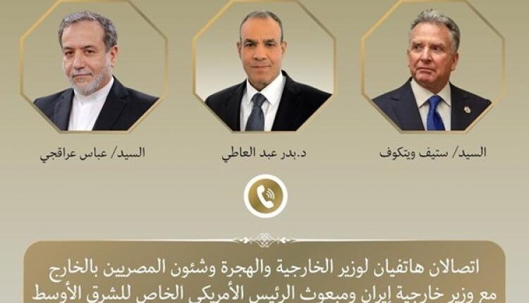 جرى اتصالان هاتفيان بين د. بدر عبد العاطي وزير الخارجية والهجرة مع “ستيف ويتكوف” مبعوث الرئيس الأمريكي الخاص للشرق الأوسط و “عباس عراقجي” وزير خارجية إيران