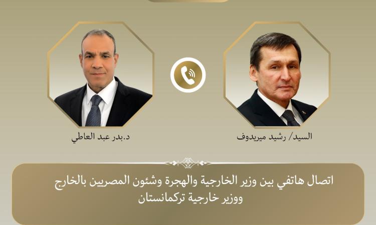 تلقى د. بدر عبد العاطي وزير الخارجية والهجرة وشئون المصريين بالخارج، اليوم الجمعة ، اتصالا هاتفيا من رشيد ميريدوف وزير خارجية تركمانستان، حيث بحث الجانبان سبل تعزيز العلاقات الثنائية بين البلدين في مختلف المجالات السياسية والاقتصادية والثقافية بما يحقق مصالح الشعبين الصديقين.