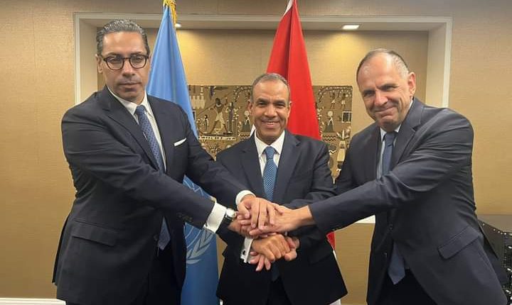 عقد د. بدر عبد العاطي، وزير الخارجية والهجرة يوم الثلاثاء 24 سبتمبر اجتماعاً ثلاثياً مع وزيرى خارجية اليونان وقبرص على هامش أعمال الدورة 79 للجمعية العامة للأمم المتحدة في نيويورك، حيث أشار إلى تطلع مصر لاستضافة الاجتماع القادم لقمة آلية التعاون الثلاثي قبل نهاية العام الجارى، مشيداً بما تتيحه الآلية من تنسيق المواقف على أعلى مستوى بين الدول الثلاث وعلى نحو يعزز من طبيعة الشراكة بينهم.