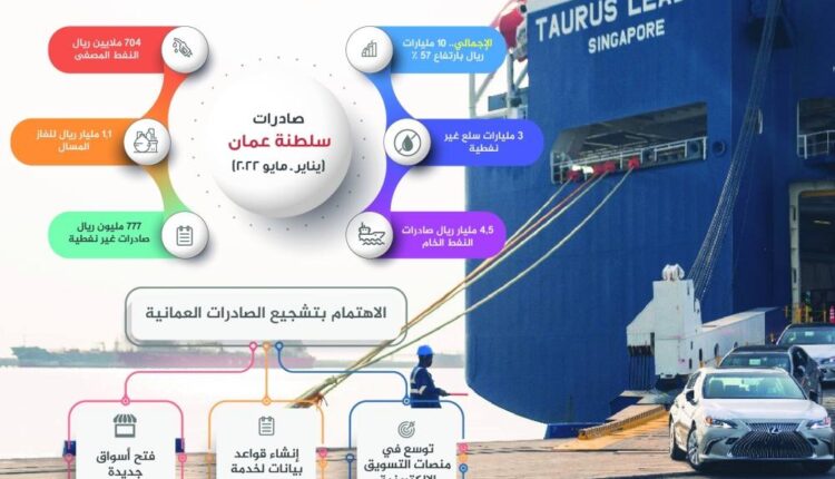 كشفت تقارير اقتصادية عُمانية عن ارتفاع إجمالي صادرات سلطنة عُمان خلال الأشهر الخمس الأولى من العام الحالي 2022 بنسبة 57 % مسجلا ما يقرب من 10 مليارات ريال عماني مقارنه بنفس الفترة من العام الماضي 2021، وتضمن هذا الإجمالي تصدير سلع غير نفطية عمانية المنشأ تتجاوز قيمتها 3 مليارات ريال.