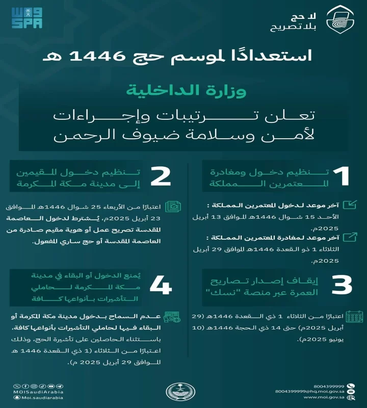 استعدادًا لموسم حج هذا العام 1446 هـ، أعلنت وزارة الداخلية السعودية عددًا من الترتيبات والإجراءات التي تهدف إلى المحافظة على سلامة حجاج بيت الله الحرام، وأداء فريضة الحج بأمن ويسر وطمأنينة، وذلك وفق التالي: