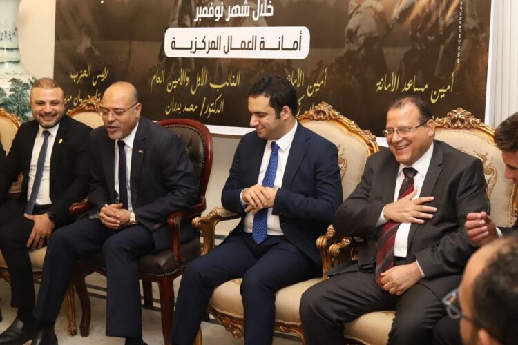 استقبل الدكتور محمد بدران، النائب الأول والأمين العام لحزب مصر أكتوبر، محمد جبران رئيس إتحاد عمال مصر، ومجدي البدوي المقرر المساعد للجنة النقابات والعمل الأهلى بالحوار الوطني، وعماد حمدي نائب رئيس اتحاد العمال ورئيس النقابة العامة للكيماويات، وخالد الفقى نائب رئيس اتحاد العمال ورئيس النقابة العامة للصناعات الهندسية، وبحضور عماد رشاد، أحمد كرم، روض الحنفي، الأمناء العام المساعدين بالحزب، وليد قوطة أمين التنظيم، رنا النطار أمين الشئون العربية المركزية، عمرو قرواش أمين مساعد العمل الجماهيري بالمركزية، محمد الأشقر رئيس قطاع وسط الدلتا، علاء ذكي أمين أمانة العمال المركزية، مصطفى كمال أمين مساعد أمانة العمال المركزية، محمد عادل عضو هيئة مكتب أمانة العمال المركزية، وأحمد ياسين سكرتير مكتب أمانة العمال المركزية.