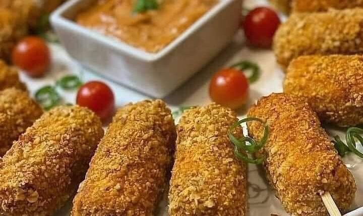 8_غلفيها بالدقيق ثم البيض ثم بالشوفان و التوست المطحون ثم ضعيها جانبا على صينية مدهونة بالزيت واشويهم في فرن حرارته 180 لمدة 15 دقيقة