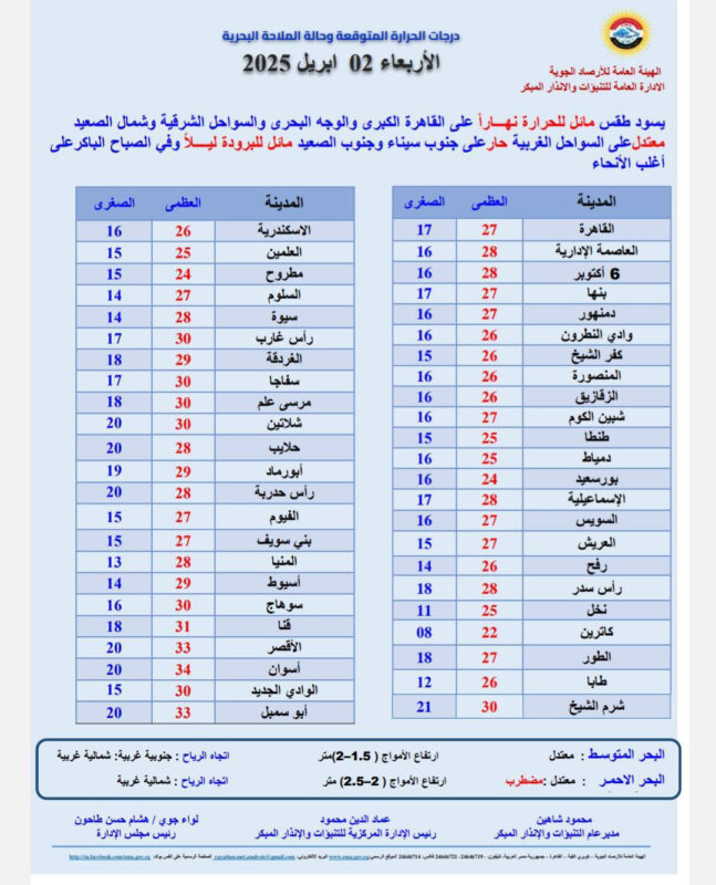 وحذرت الأرصاد من اضطراب حركة الملاحة البحرية على البحر الأحمر وخليج السويس، حيث تتراوح سرعة الرياح بين 50 و70 كم/س، وارتفاع الأمواج بين 2 إلى 2.5 متر.
