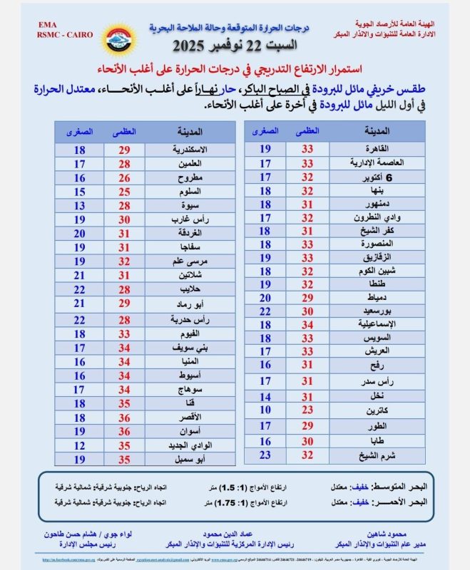 أما بالنسبة لحالة البحر المتوسط فخفيفة إلى معتدلة وارتفاع الموج من 1 إلى 1.5 متر واتجاه الرياح تكون جنوبية شرقية إلى شمالية شرقية، وبالنسبة لحالة البحر الأحمر فتكون خفيفة إلى معتدلة وارتفاع الموج من 1 إلى 1.75 متر واتجاه الرياح تكون جنوبية شرقية إلى شمالية شرقية.