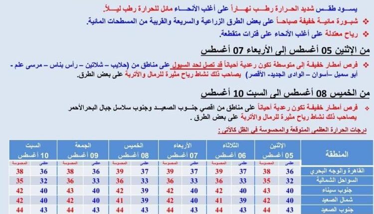 وقالت الأرصاد الجوية إنه يسود اعتبارا من اليوم الإثنين وحتى السبت المقبل، طقس شديد الحرارة نهارا على أغلب الاحيان الانحاء، حار على السواحل الشمالية، شديد الحرارة على جنوب سيناء والصعيد، أما عن حالة الطقس ليلا فهو معتدل على شمال البلاد ومائل للحرارة على جنوبها.
