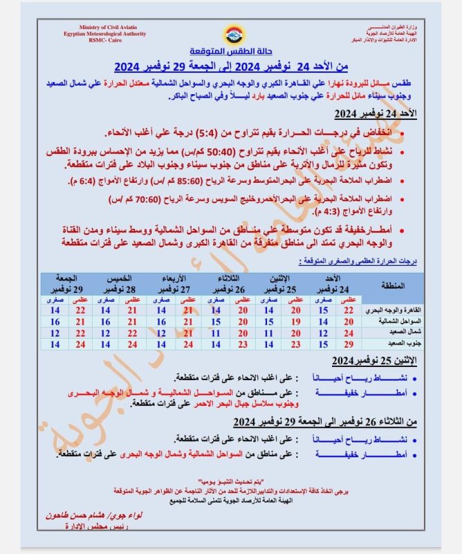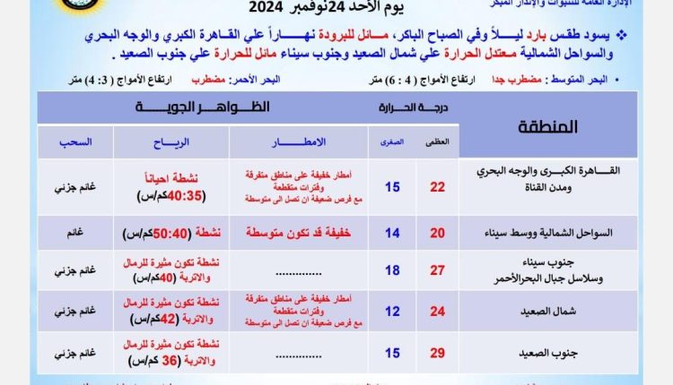 وحذرت الهيئه العامة للأرصاد الجوية من نشاط رياح على كافة الأنحاء تزيد من الإحساس ببرودة الطقس كما تكون مثيرة للرمال والأتربة على المناطق المكشوفة وعلى جنوب سيناء وجنوب البلاد.