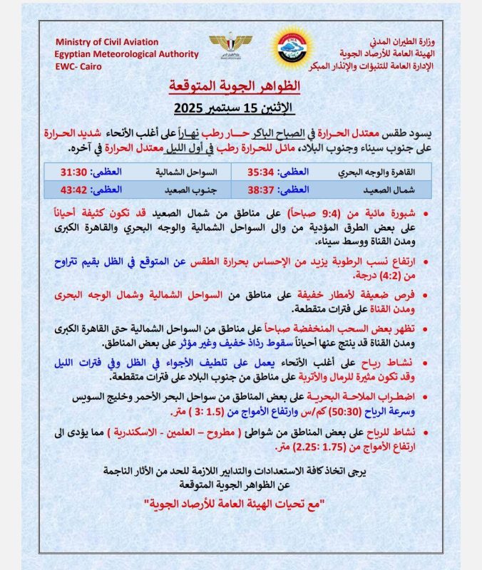 يتوقع خبراء هيئة الأرصاد الجوية أن يسود اليوم الاثنين طقس حار رطب نهارا على القاهرة الكبرى والوجه البحري والسواحل الشمالية، شديد الحرارة على جنوب سيناء وجنوب البلاد، بينما يسود طقس مائل للحرارة رطب في أول الليل معتدل في آخره على أغلب الأنحاء.