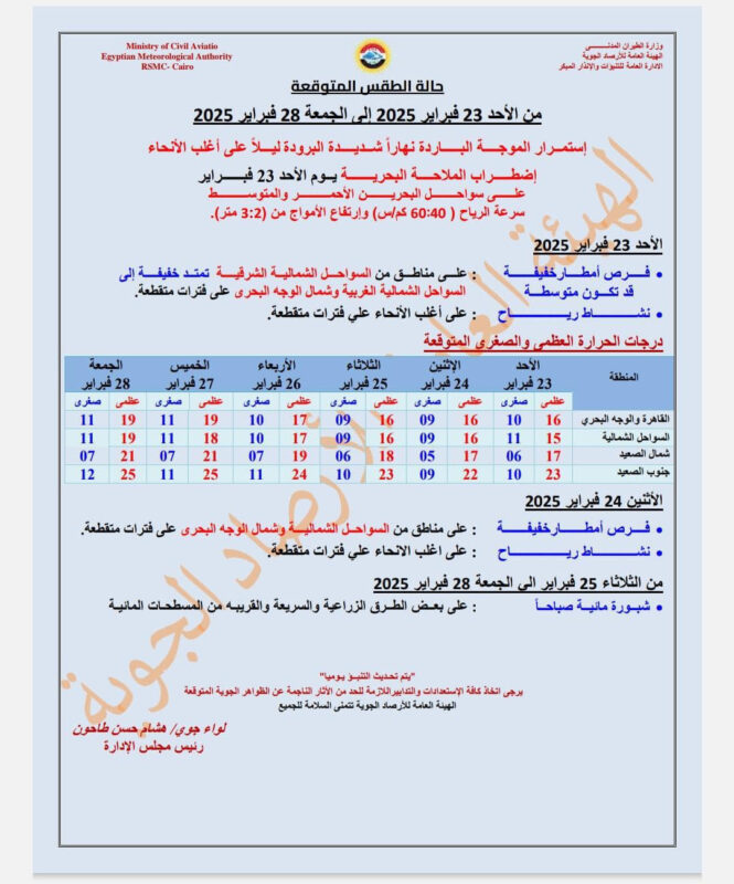 وتتوقع الهيئة سقوط أمطار خفيفة إلى متوسطة متوقعة على مناطق من السواحل الشمالية الشرقية، وقد تمتد بشكل خفيف إلى السواحل الشمالية الغربية وشمال الوجه البحري.